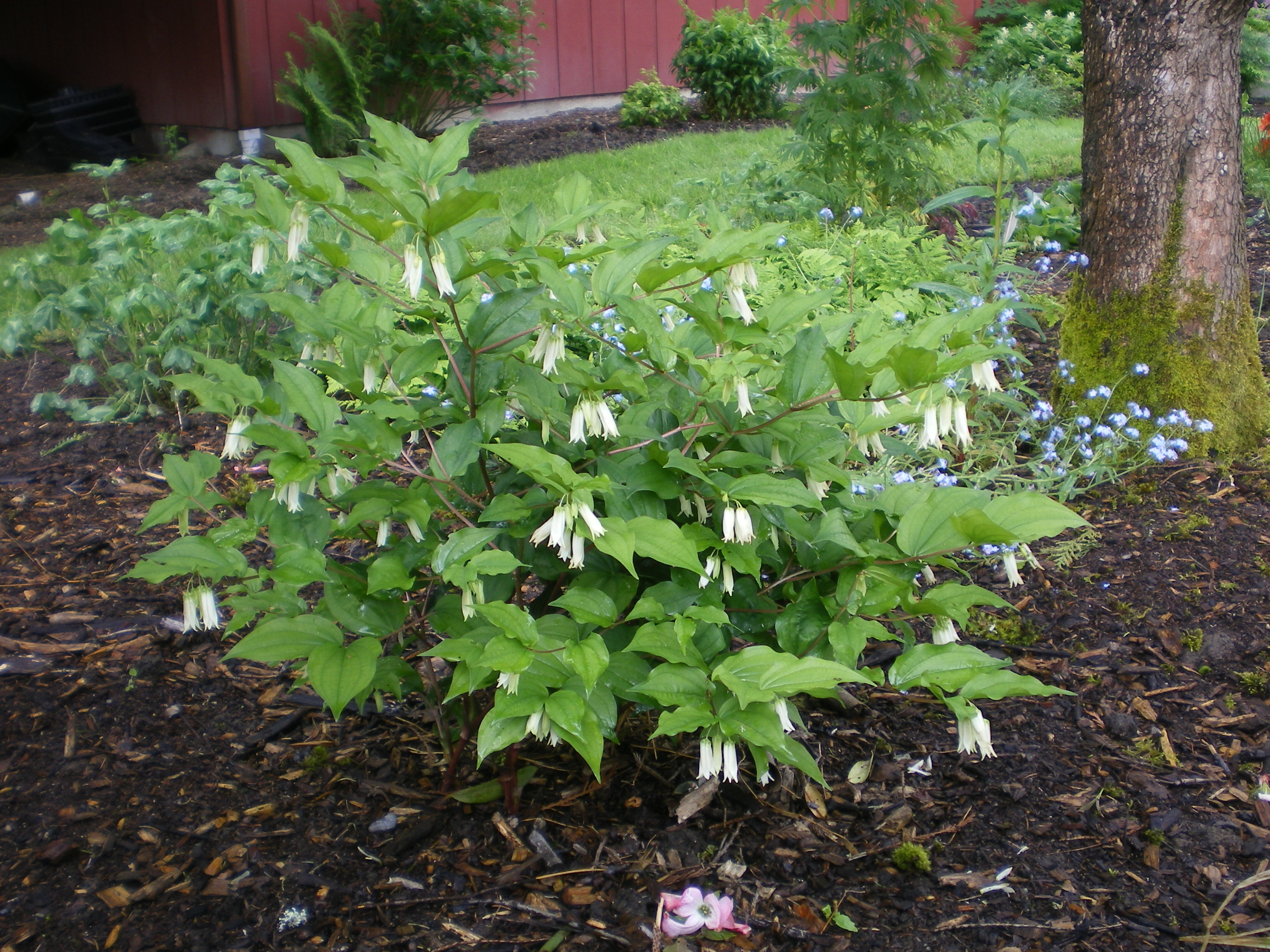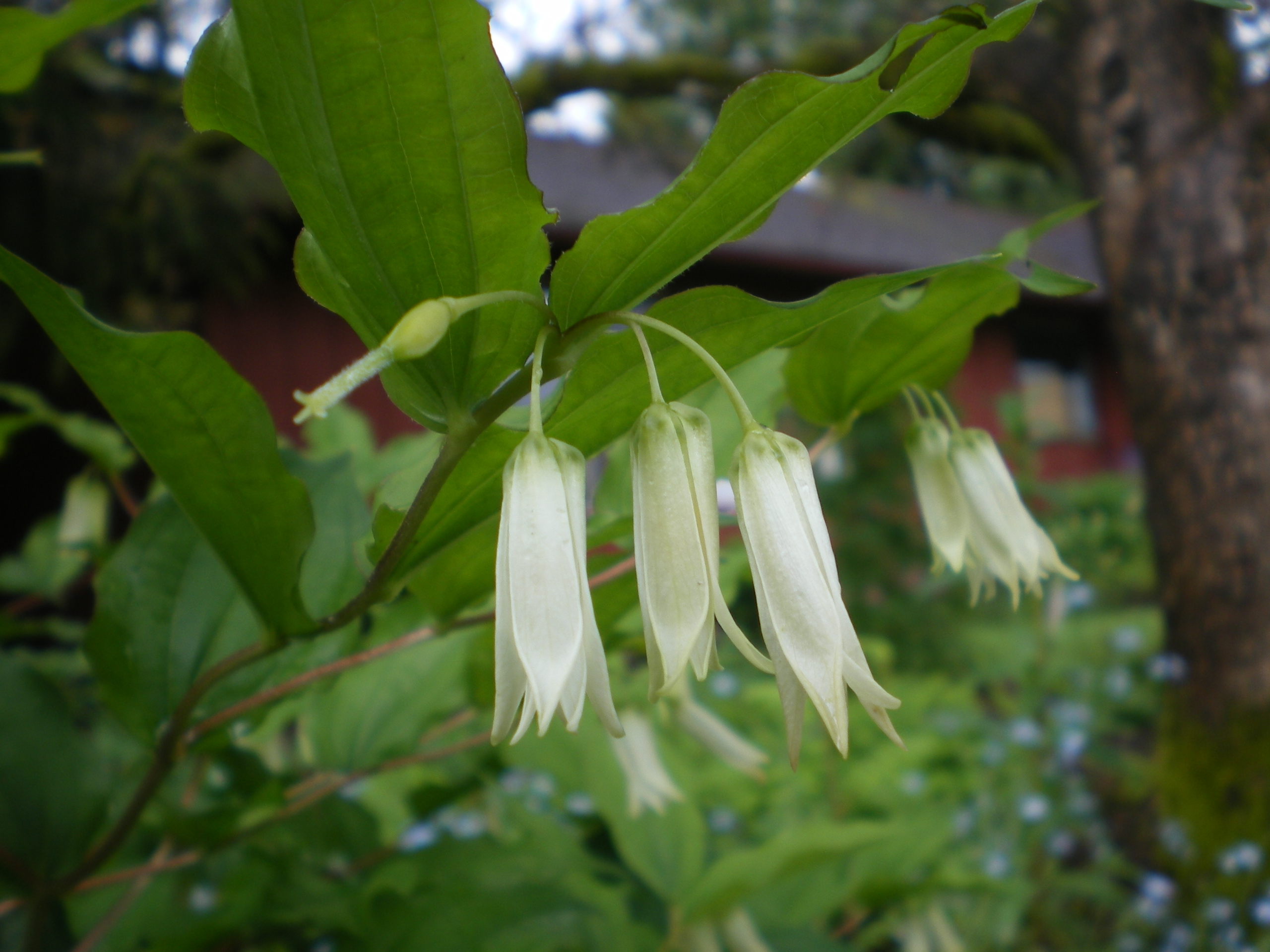 Tadpole Haven is hatching a big batch of Large-Flower Fairybells (Prosartes smithii). This perennial grows up to a maximum of three feet tall, has lovely curving stems and creamy yellow flowers. It grows in partial to full shade, in fairly well drained soil, and it makes a good companion for other woodland perennials. In my garden, it grows next to a patch of brilliant green Oak Fern (Gymnocarpium dryopteris). There is absolutely no reason why everyone should not have this plant in their garden!